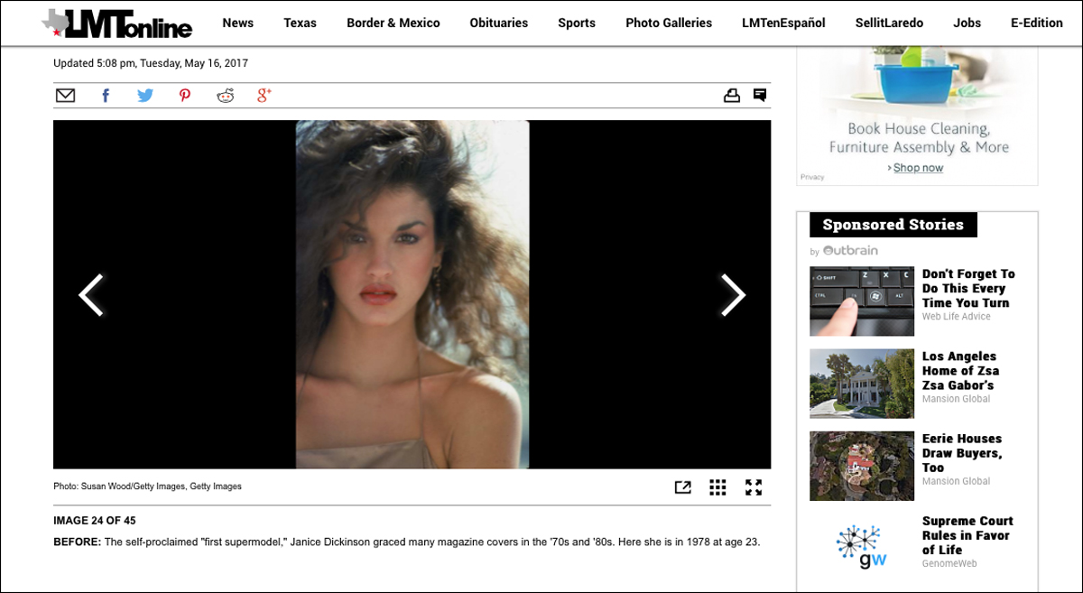 Janice Dickinson in Laredo Morning Times Written by Susan Wood, Posted in Recent Publications « Robert Lee Morris in The Adventurine Gloria Steinem in Vanity Fair France »