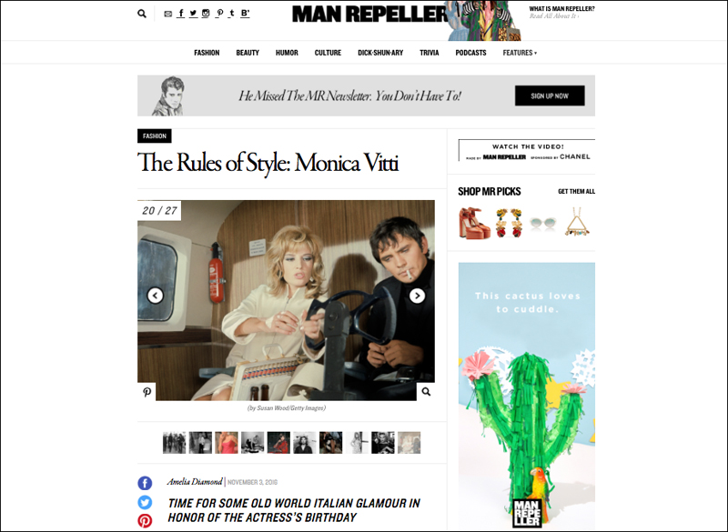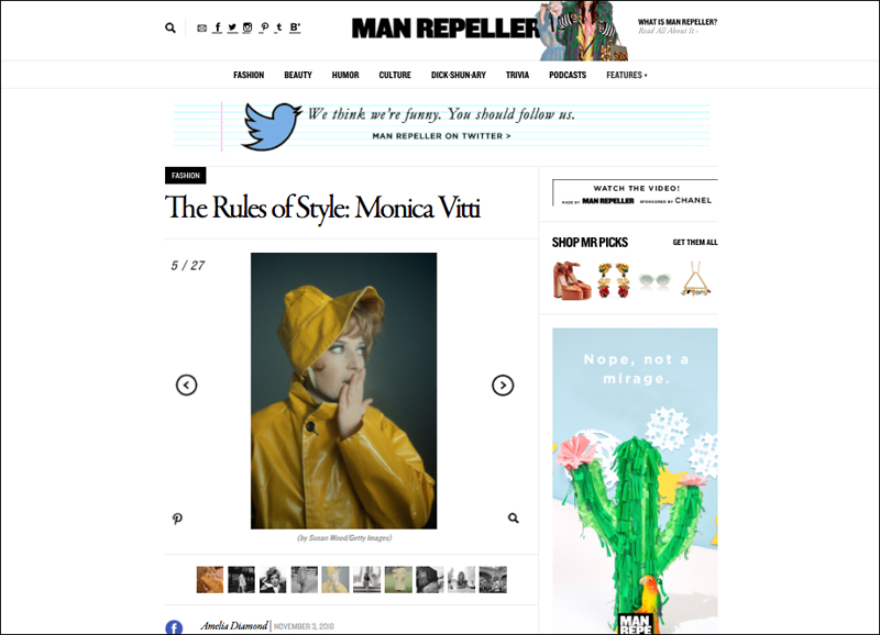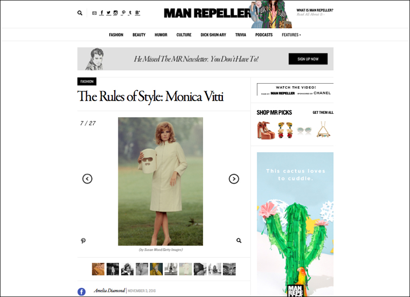 Monica Vitti on Man Repeller Written by Susan Wood, Posted in Recent Publications « Chet Baker in Entertainment Weekly Jim Brown in Esquire »