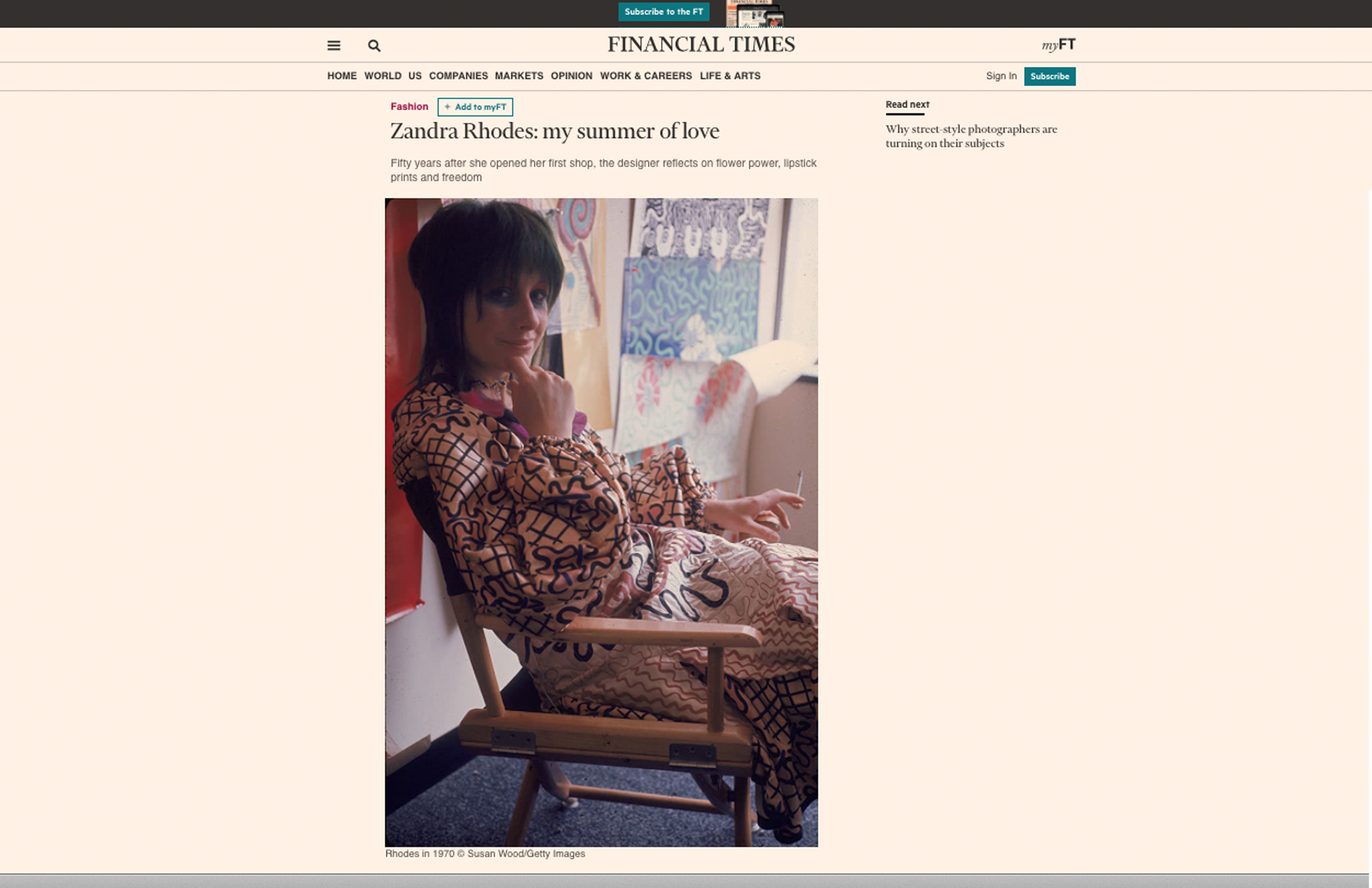 Zandra Rhodes in The Financial Times Written by Susan Wood, Posted in Recent Publications « Lauren Family in Ralph Lauren Magazine David Hockney in W Magazine »